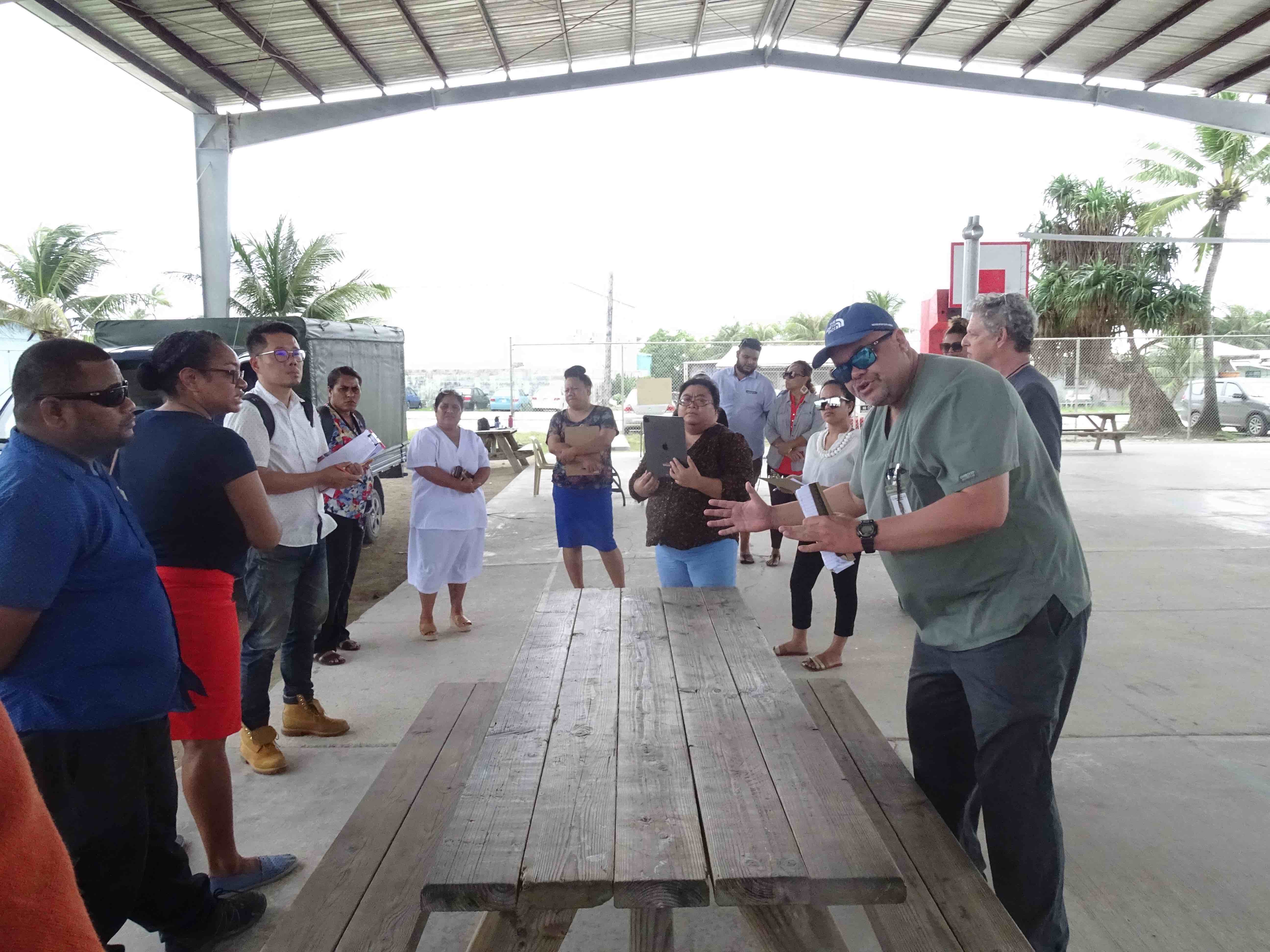Marshall Islands Public Health Director Dr. Frank Underwood, right, leads a recent Ministry of Health and Human Services practice exercise for the use of gymnasiums to manage Covid cases once the country begins experiencing community transmission.