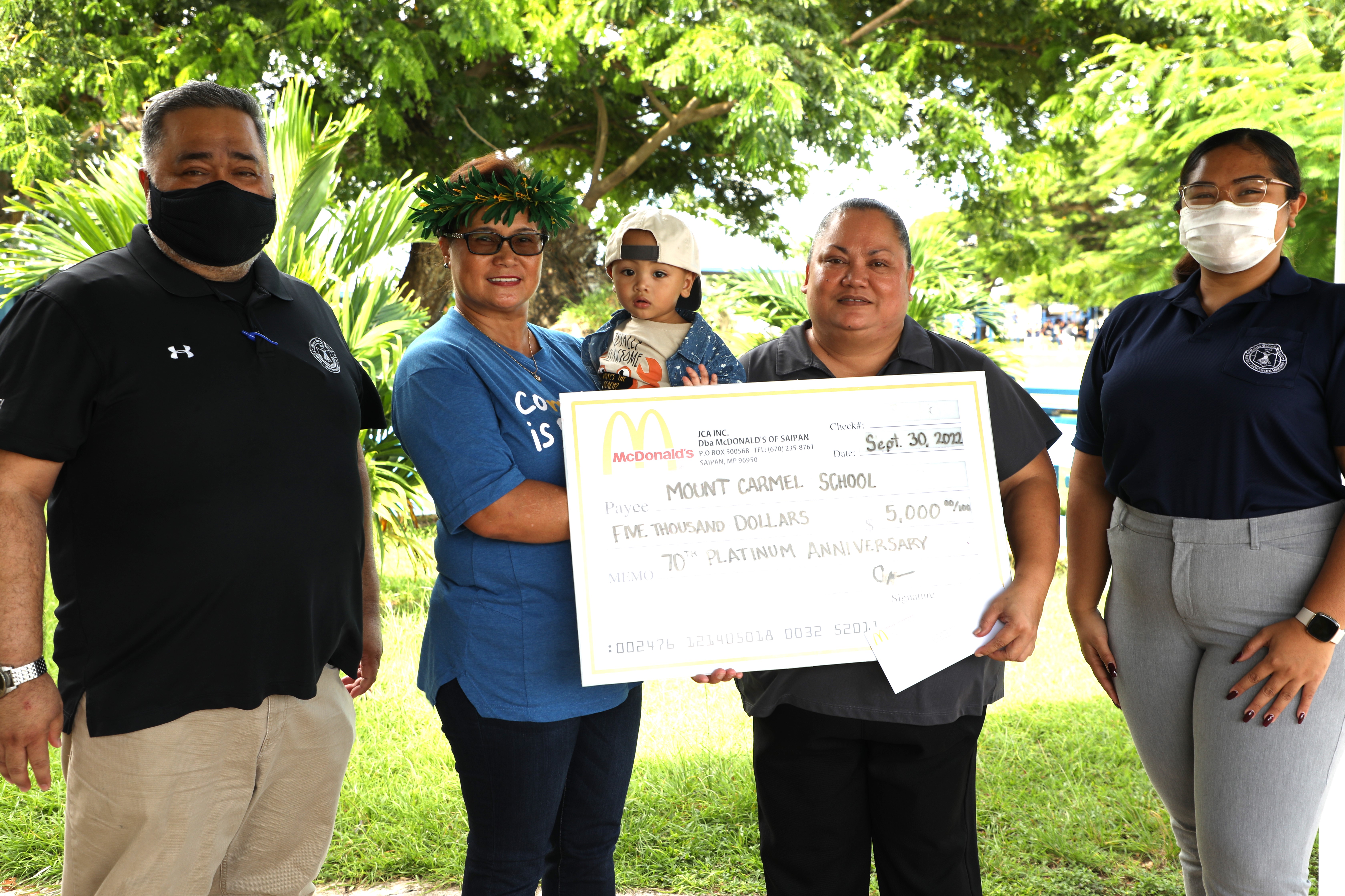 Mount Carmel School thanks McDonald’s of Saipan for their recent donation of $5,000 in celebration of the school’s 70th anniversary. For more information about the school’s 70th anniversary and how to support the school, visit www.mountcarmelsaipan.com/.