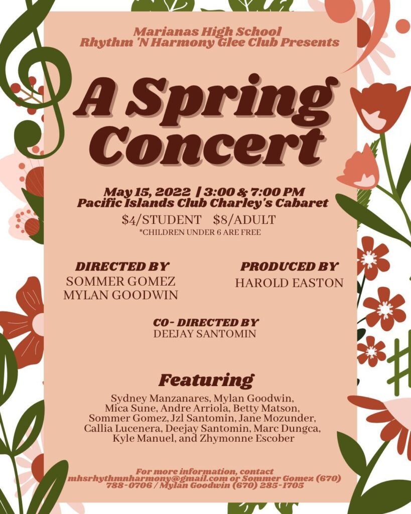 (MHS) — This weekend, Sunday, May 15, the Marianas High School, Rhythm ‘N Harmony, will be presenting its Spring Concert. This event will provide an afternoon and evening of enjoyable music entertainment performed by the regional and national award-winning Rhythm ‘N Harmony, the Marianas High School Glee Club, student-directed by Sommer Gomes and Mylan Goodwin, and produced by Harold Easton, FOA president.