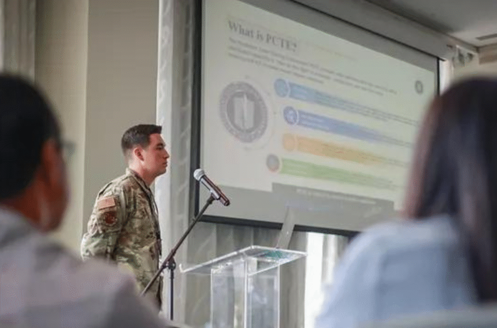 Guam National Guard. U.S. Cyber Command Capt. Stephen Romans explains how a units train using a realistic cyber range during a meeting hosted by the National Guard at the Dusit Beach Resort July 17, 2023.