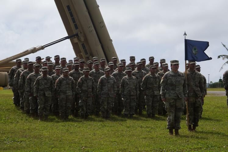 Guam Army National Guard soldiers stand in front of a Terminal High Altitude Area Defense system installation Feb. 7, 2023, at Arc Light Park on Andersen Air Force Base.