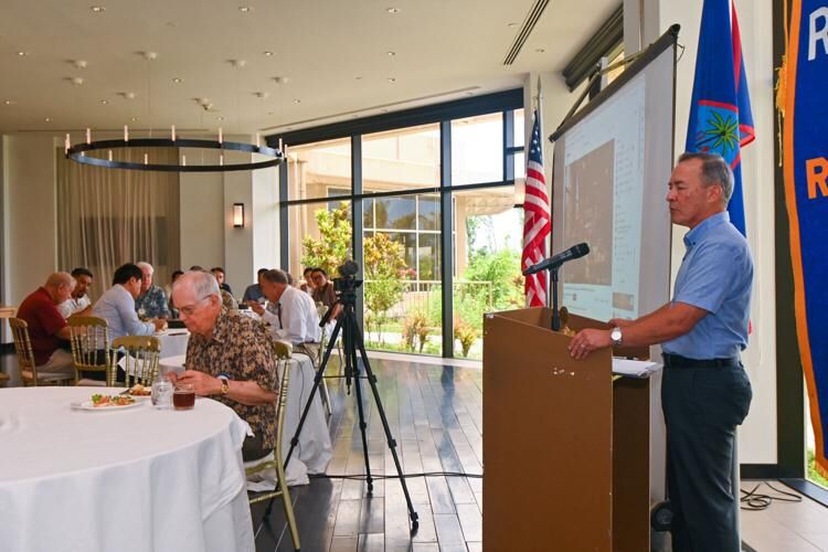 Del. James Moylan, right, is the guest speaker at the Rotary Club of Guam meeting Thursday, Aug. 17, 2023, at the Hyatt Regency Guam in Tumon.