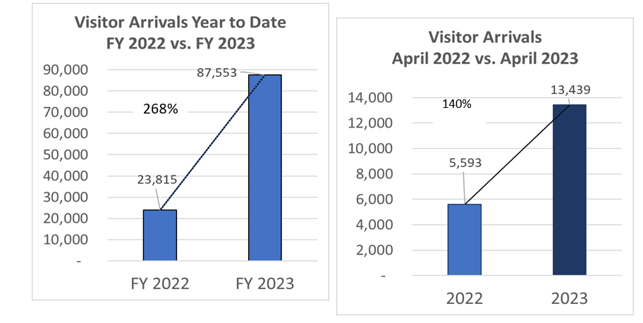 (MVA) — According to the Marianas Visitors Authority, arrivals to Saipan, Tinian and Rota grew 140% to 13,439 visitors in April 2023, compared to 5,593 visitors received in April 2022. Year-to-date arrivals this fiscal year have already exceeded the total number of visitors received last fiscal year (23,815 visitors) as the destination continues to make incremental gains in arrivals.
