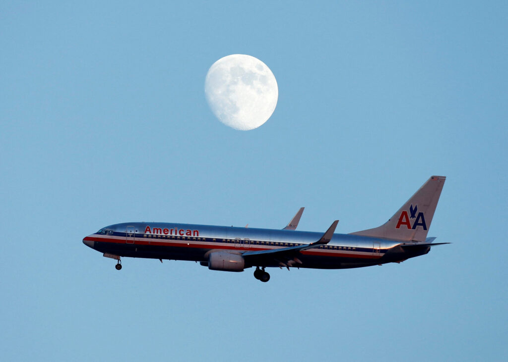 An American Airlines passenger jet glides in under the moon as it lands at LaGuardia airport in New York, New York, August 28, 2012. REUTERS/Eduardo Munoz/File Photo