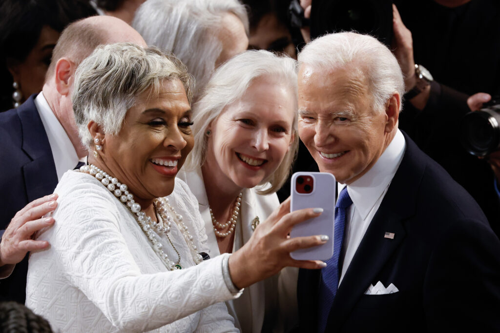President Joe Biden takes a photo with Sen. Kristen Gillibrand (D-NY), middle, and Rep. Joyce Beatty (D-OH) as he arrives to deliver the State of the Union address during a joint meeting of Congress in the House chamber at the U.S. Capitol on March 7, 2024, in Washington, D.C. (Chip Somodevilla/Getty Images/TNS)