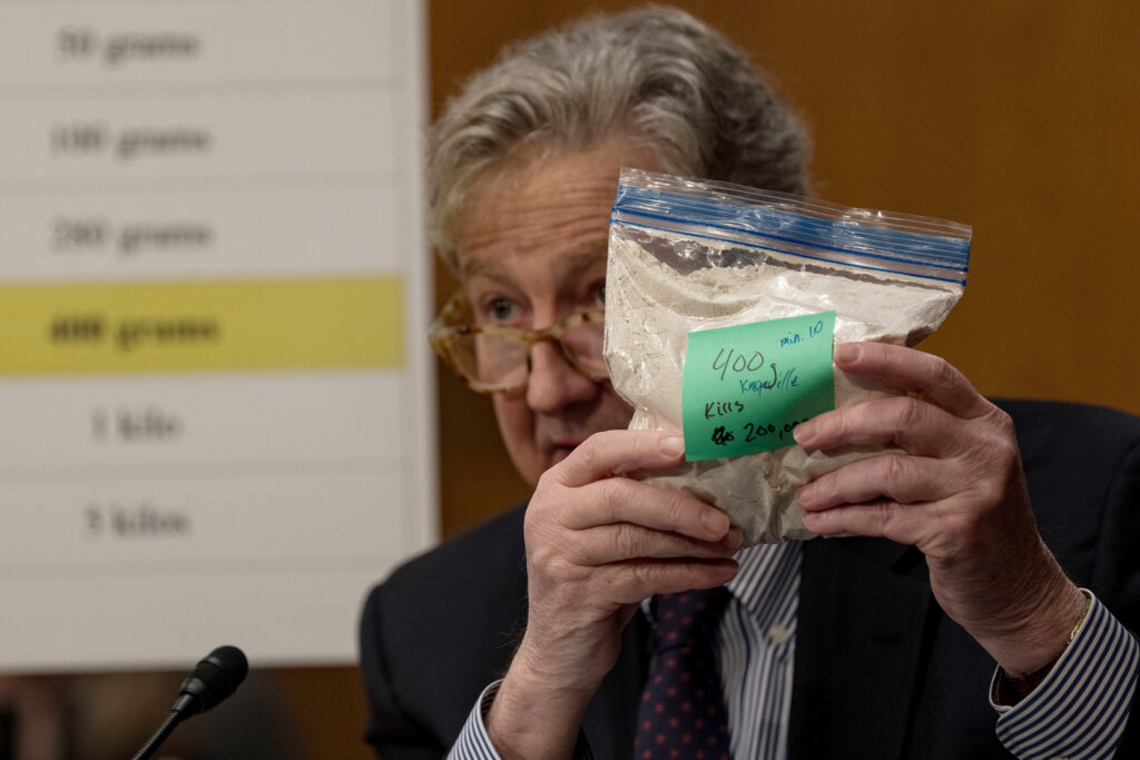 Sen. John Kennedy (R-LA) holds up a bag representing 400g of fentanyl as he speaks during a Senate Banking, Housing, and Urban Affairs committee hearing on Jan. 11, 2024, in Washington, D.C. The hearing examined legislative solutions and public education for stopping the flow of fentanyl into and throughout the United States. (Kent Nishimura/Getty Images/TNS)
