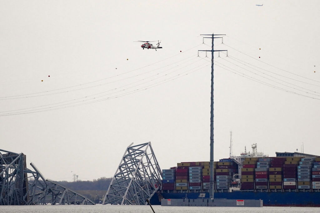 A helicopter flies over the Dali cargo vessel which crashed into the Francis Scott Key Bridge causing it to collapse, in Baltimore, Maryland, U.S., March 26, 2024.