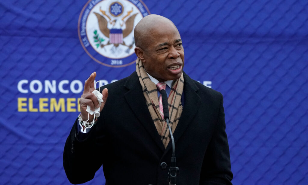 New York Mayor Eric Adams greets students and parents at Concourse Village Elementary School in the Bronx on Jan. 3, 2022. A set of corporate entities co-founded by Frank Carone, Adams’ trusted political confidante, helped orchestrate a sprawling “money laundering scheme” that ultimately bilked $3.5 million from a major insurance company, according to a new federal lawsuit. (Timothy A. Clary/AFP/Getty Images/TNS)