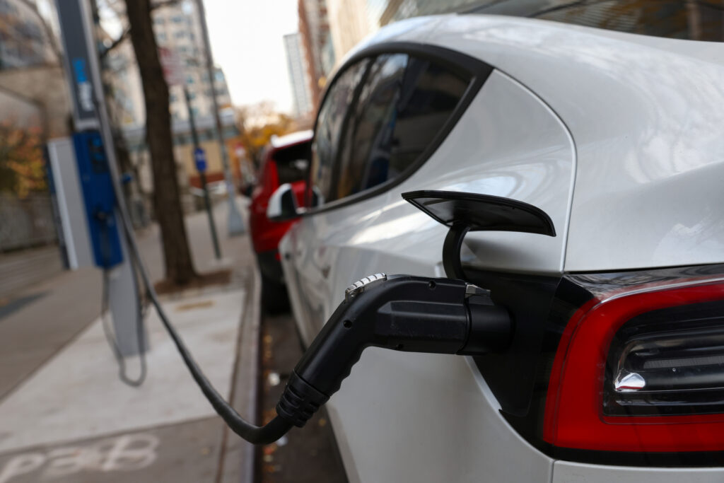 An electric vehicle is seen charging in Manhattan, New York, U.S., December 7, 2021. REUTERS/Andrew Kelly
