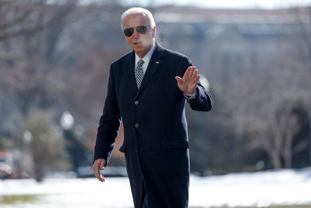 U.S. President Joe Biden waves towards the media after landing on the South Lawn of the White House in Washington, U.S., January 22, 2024.