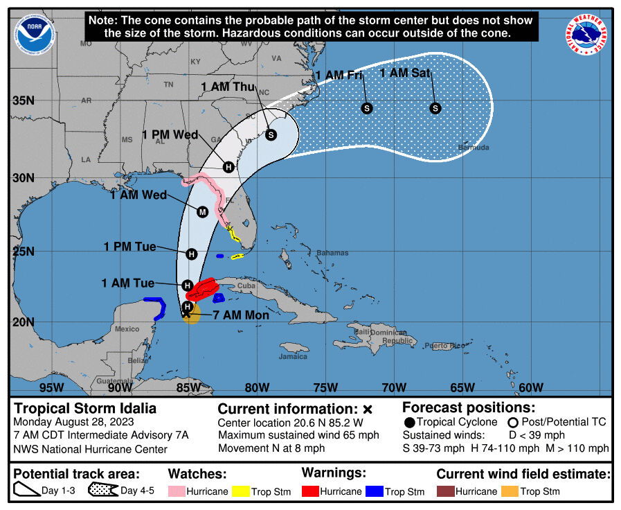 Tropical Storm Idalia is expected to strengthen into a hurricane on Monday. (Courtesy of National Hurricane Center/TNS)