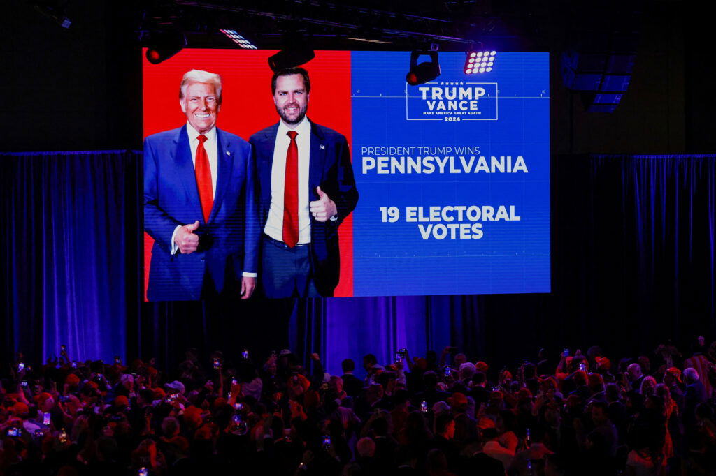 A projection regarding Pennsylvania’s electoral votes is shown at Republican presidential nominee and former President Donald Trump’s election night watch party in Palm Beach County Convention Center, in West Palm Beach, Florida, Nov. 6, 2024.