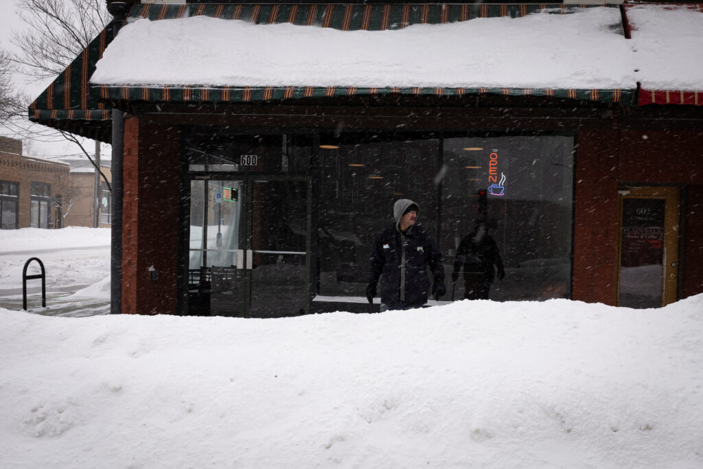 A man stands outside a coffee shop after a blizzard left several inches of snow, in downtown Des Moines, Iowa, U.S., January 13, 2024.