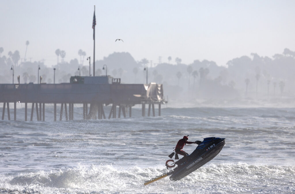The pier is a popular surf spot, but no one dared to venture out — except an L.A. County lifeguard. The lifeguard maneuvered a jet ski across the whitewater and rode some of the larger waves, apparently practicing his rescue skills.