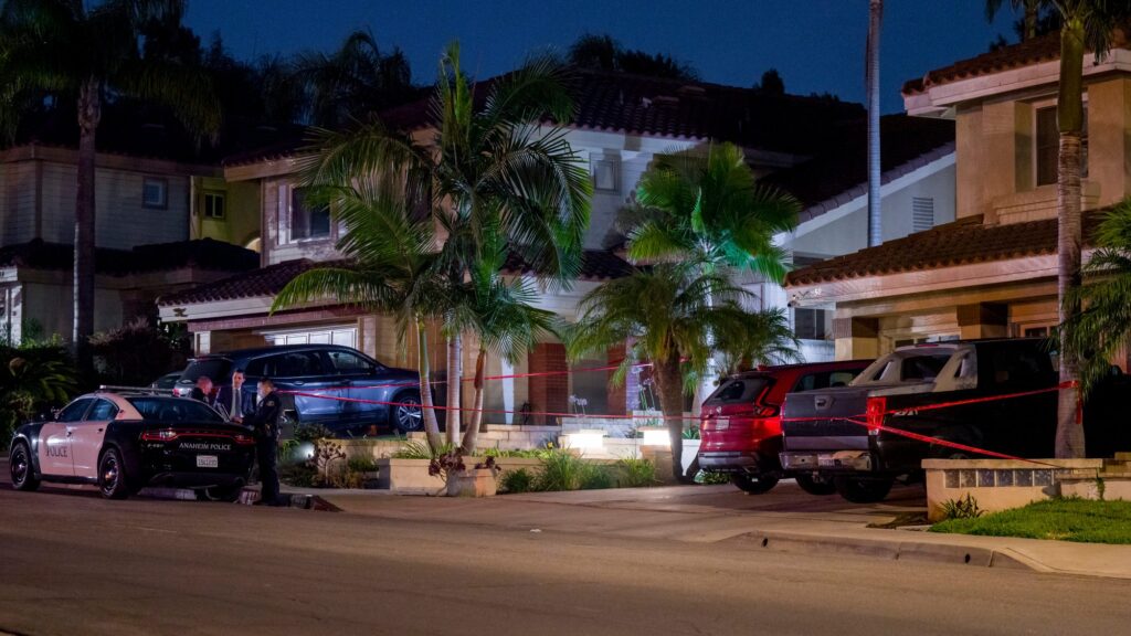Red crime scene tape surrounds a home, right, in the 8500 block of E. Canyon Vista Drive in Anaheim on Thursday, Aug. 3, 2023, where Orange County Superior Court Judge Jeffrey Ferguson was taken into custody by Anaheim police after a shooting death of his wife, according to multiple sources. (Leonard Ortiz/Orange County Register/SCNG/TNS)
