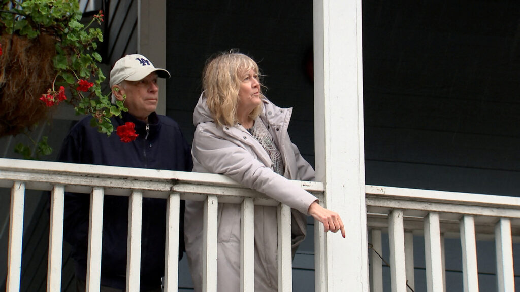 Alice White-Zmigrocki, 66, and her husband Joe Zmigrocki, 74, look from a Inn at Playa del Rey’s balcony as workers (not pictured) pump flood water from the street surrounding the place, after heavy rains hit Southern California, in Los Angeles, California, U.S., February 5, 2024, as seen in this scree grab taken from a video.