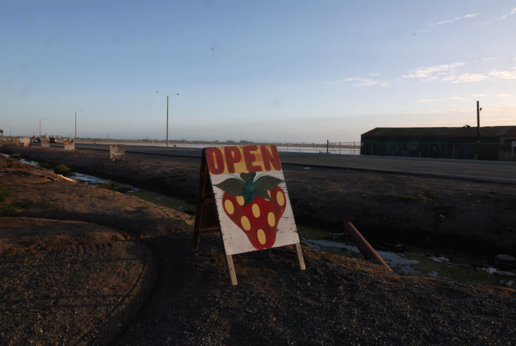 A sign advertising strawberries stands on a roadside, near fields in Oxnard, California, June 15, 2025.