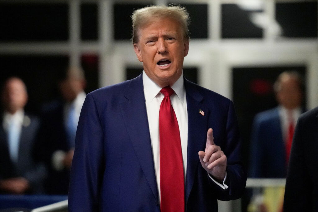Former President Donald Trump speaks upon arriving at Manhattan criminal court, Tuesday, April 30, 2024, in New York.