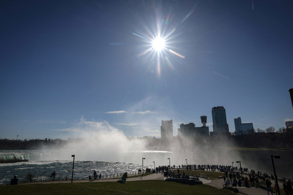 Tourists look at the Horseshoe Falls, ahead of the Solar Eclipse that will take place across parts of the United States and Canada on April 8, at Niagara Falls, New York, U.S., April 7, 2024.