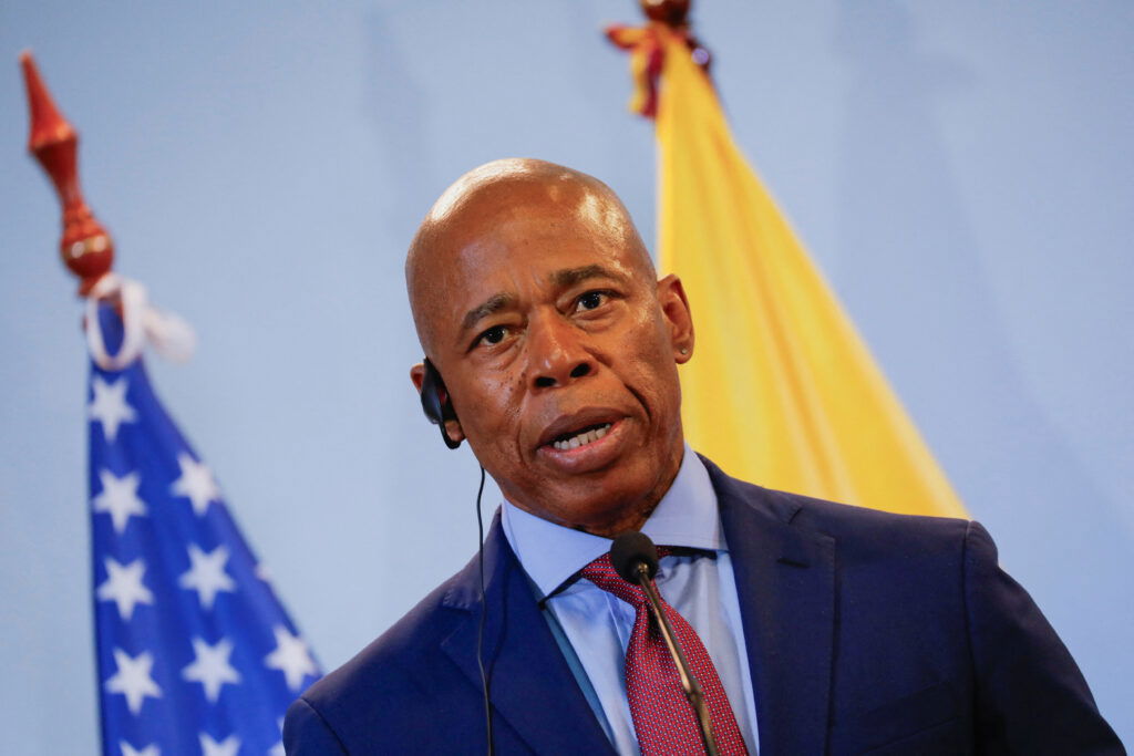 New York City Mayor Eric Adams reacts as he and Ecuadorian Minister for Foreign Affairs and Human Mobility Gustavo Manrique (not pictured) deliver a statement following a meeting in Quito, Ecuador October 6, 2023.