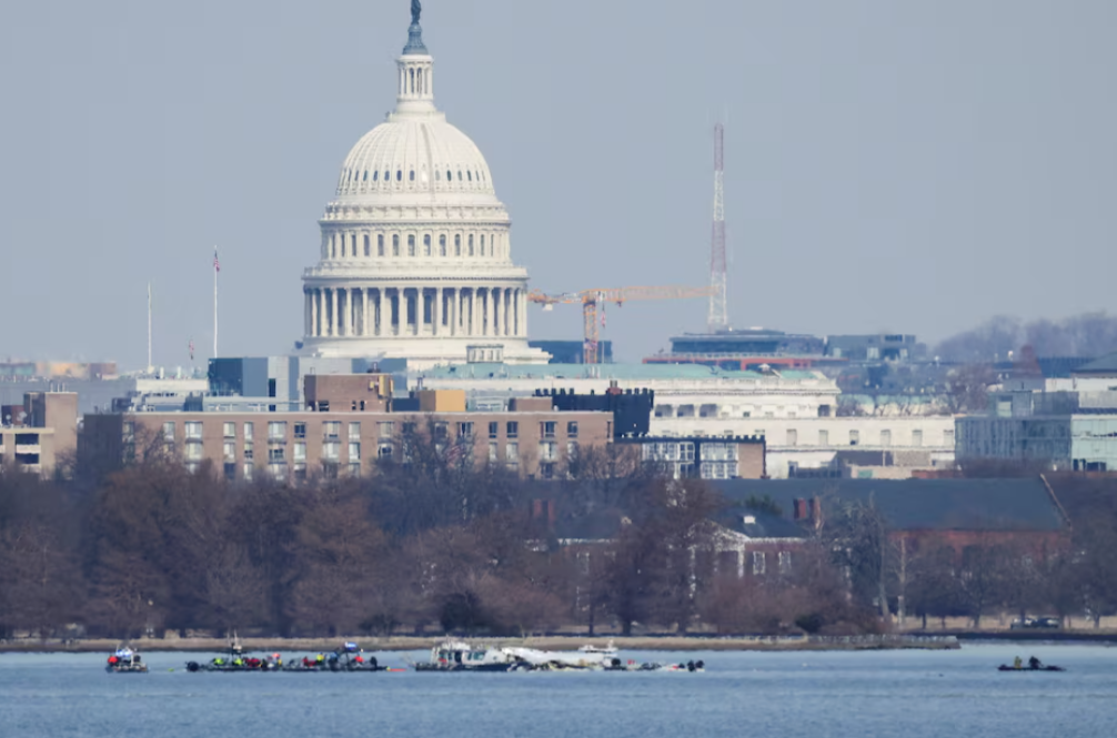 Search and rescue teams work in the aftermath of the collision of American Eagle flight 5342 and a Black Hawk helicopter that crashed into the Potomac River, with the Capitol dome in the background, as seen from Virginia, Jan. 30, 2025.