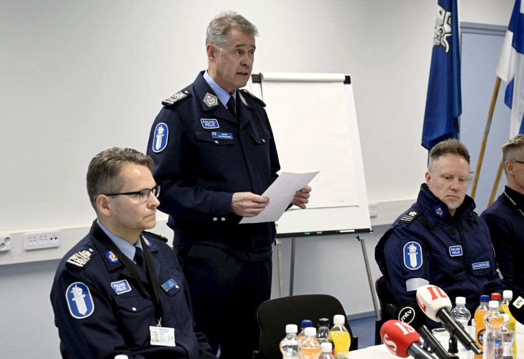 National Police Commissioner Seppo Kolehmainen speaks while Police Chief Ilkka Koskimaki and Inspector Tomi Salosyrja look on during a police press conference on the Viertola school shooting incident in Vantaa, Finland, on April 2, 2024. One sixth grade pupil died and two others were seriously injured in the Vantaa school shooting on Tuesday.