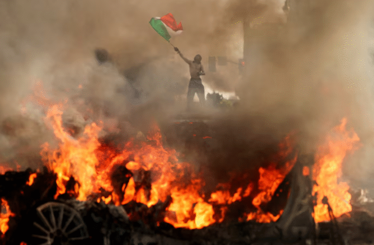 A man waves a Mexican flag as smoke and flames rise from a burning vehicle in downtown Los Angeles. REUTERS LOS ANGELES (Reuters) — Police declared all of downtown Los Angeles to be an unlawful assembly area and ordered protesters to go home on Sunday night after a third day of violence hit demonst…