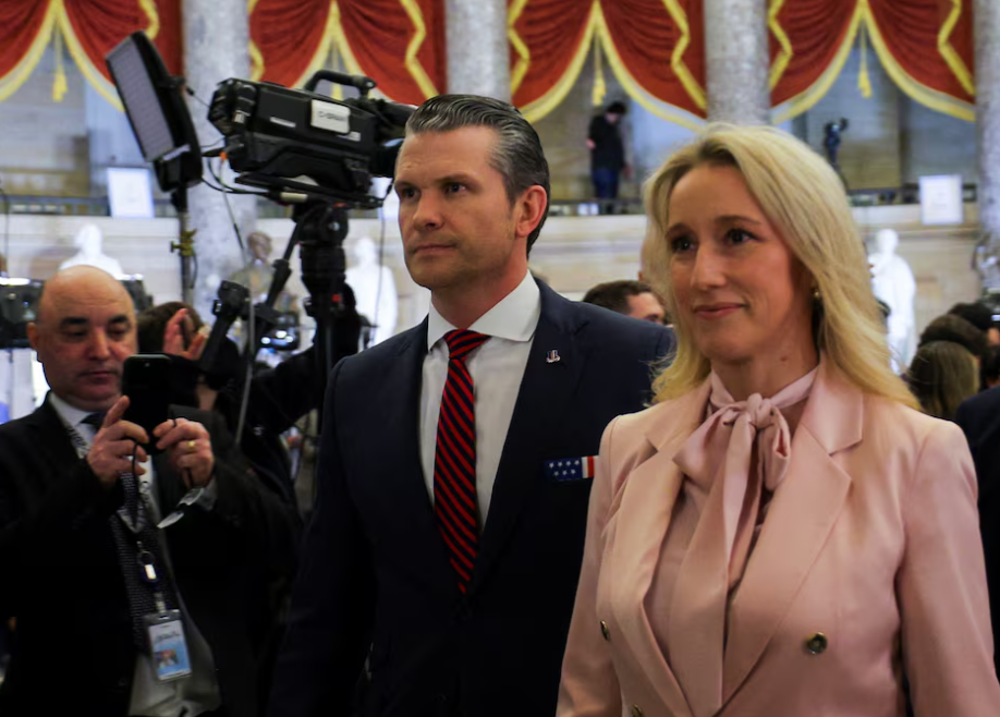 U.S. Secretary of Defense Pete Hegseth and his wife Jennifer Rauchet walk through Statuary Hall prior to President Donald Trump’s speech to a joint session of Congress at the U.S. Capitol in Washington, D.C., March 4, 2025.