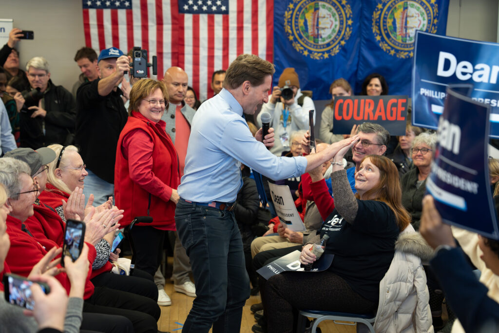 Dean Phillips high-fives a supporter as he takes the stage to speak to a crowd at a GOTV event at the Nashua Senior Activity Center Saturday, Jan. 20, 2024, Nashua, New Hampshire. (Glen Stubbe/Minneapolis Star Tribune/TNS)
