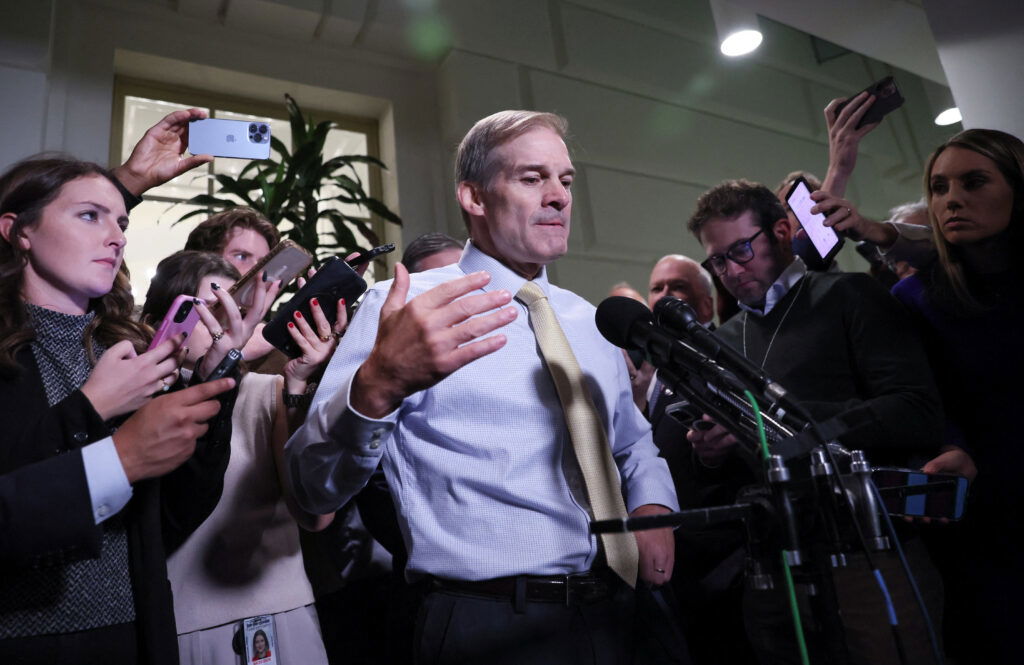 Rep. Jim Jordan (R-OH) faces reporters after it was reported that Jordan vowed to continue his floundering bid for speaker of the U.S. House of Representatives after earlier saying he would back a plan to empower Speaker of the House Pro Tempore Patrick McHenry (R-NC) to hold the post until January, at the U.S. Capitol in Washington, U.S., October 19, 2023.