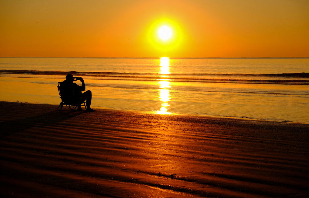 Sitting on a beach at water’s edge, a man takes a photo as the sun rises over Hilton Head Island, South Carolina, U.S., March 16, 2023.