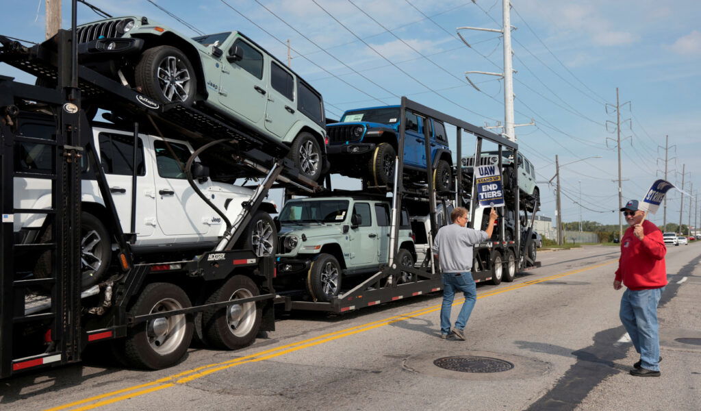 A car hauler transporting Jeep Wranglers drives past striking United Auto Workers members outside the Stellantis Jeep Plant in Toledo, Ohio, U.S. September 17, 2023.