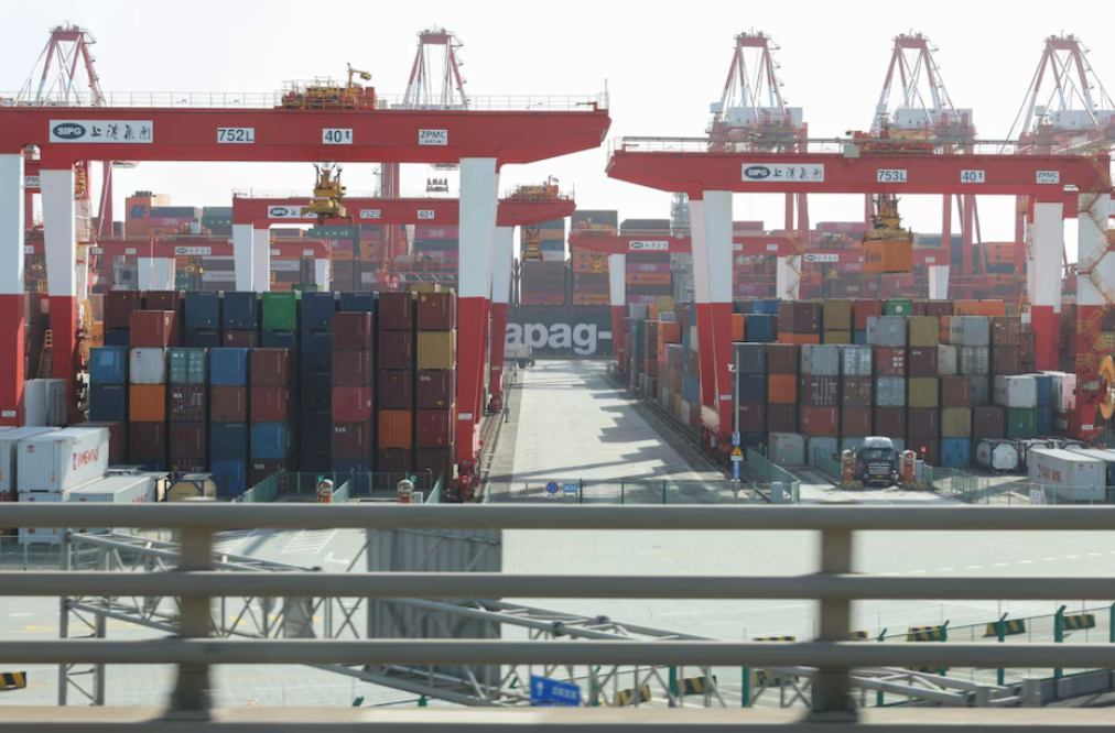 Gantry cranes stand near shipping containers at Yangshan Port outside of Shanghai, China, Feb. 7, 2025.