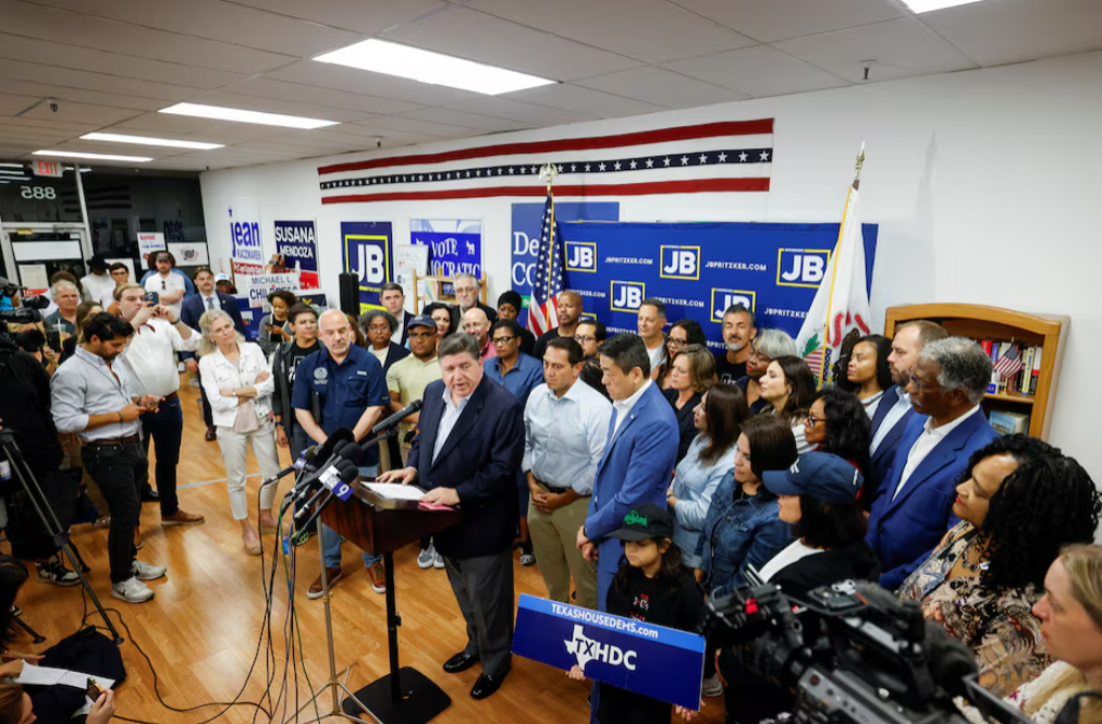 Illinois Governor J.B. Pritzker speaks in front of Democratic lawmakers from Texas during a press conference, after they left their state to deny Republicans the quorum needed to redraw the state’s 38 congressional districts, in Carol Stream, Illinois, Aug. 3, 2025.