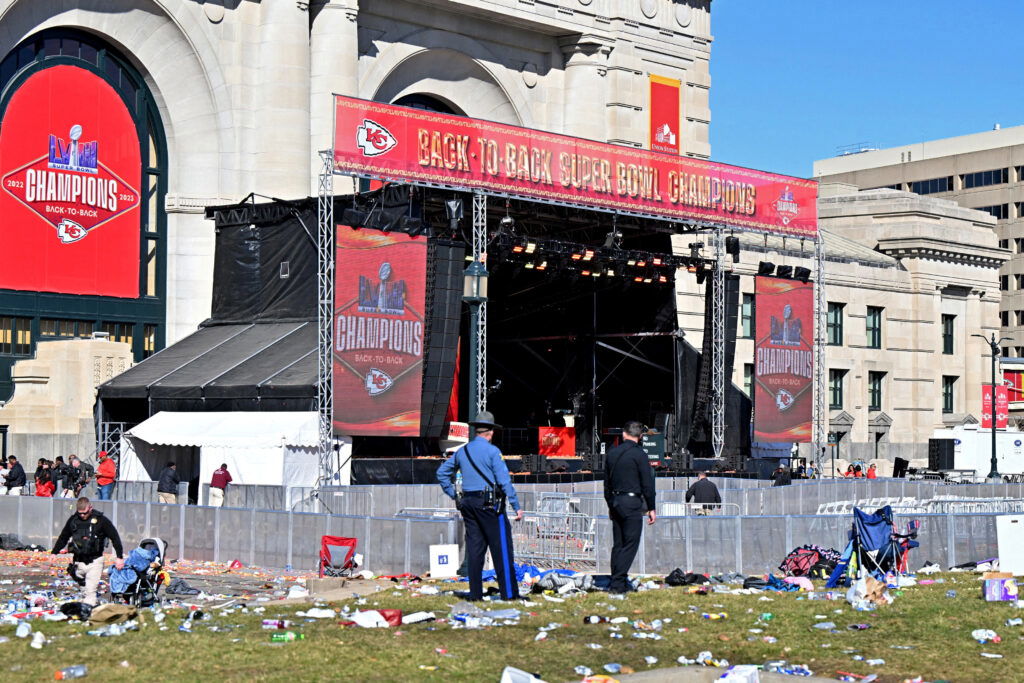 FILE PHOTO: Feb 14, 2024; Kansas City, MO, USA; Police clear the area after shots were fired after the celebration of the Kansas City Chiefs winning Super Bowl LVIII.