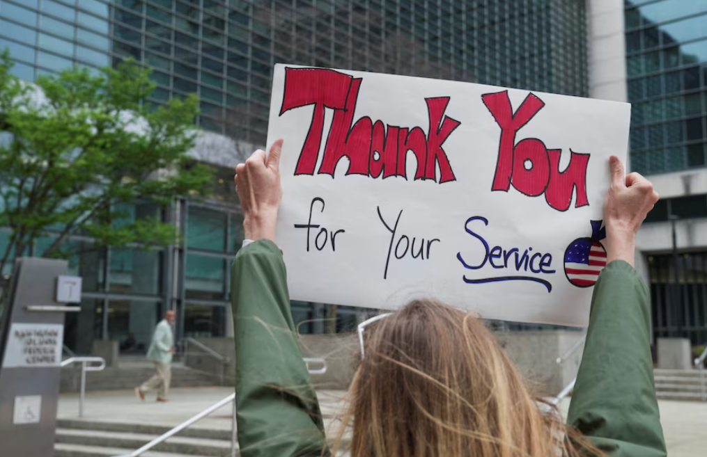 A demonstrator holds up a sign of support outside of the Sam Nunn Atlanta Federal Center, following the firings of individuals working in the U.S. Department of Education, after the Trump administration began mass layoffs of thousands of employees, in Atlanta, Georgia, April 2, 2025.