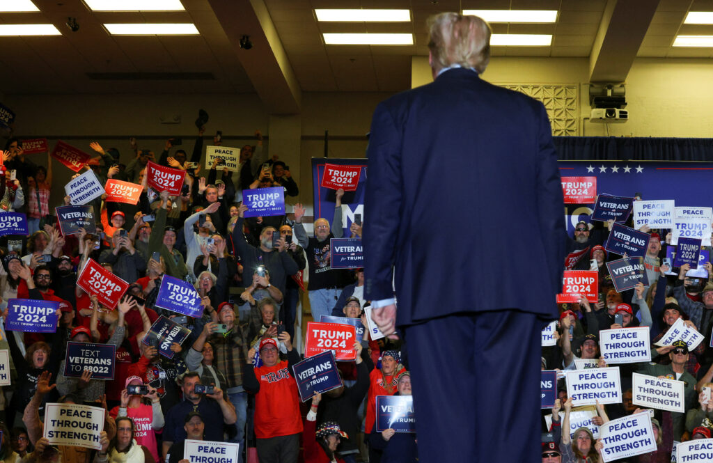 Republican presidential candidate and former U.S. President Donald Trump attends a campaign rally in Claremont, New Hampshire, U.S., November 11, 2023.