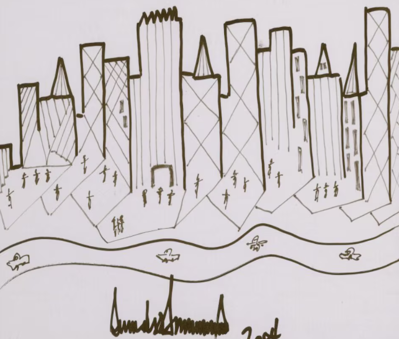 A New York cityscape skyline drawing signed by Donald Trump and dated 2004, which Sotheby's auction house said was created for the Capuchin Food Pantry's benefit Doodle for Hunger, as promoted for auction on Sotheby's website in January 2020.Donald J. Trump/Sotheby’s via REUTERS