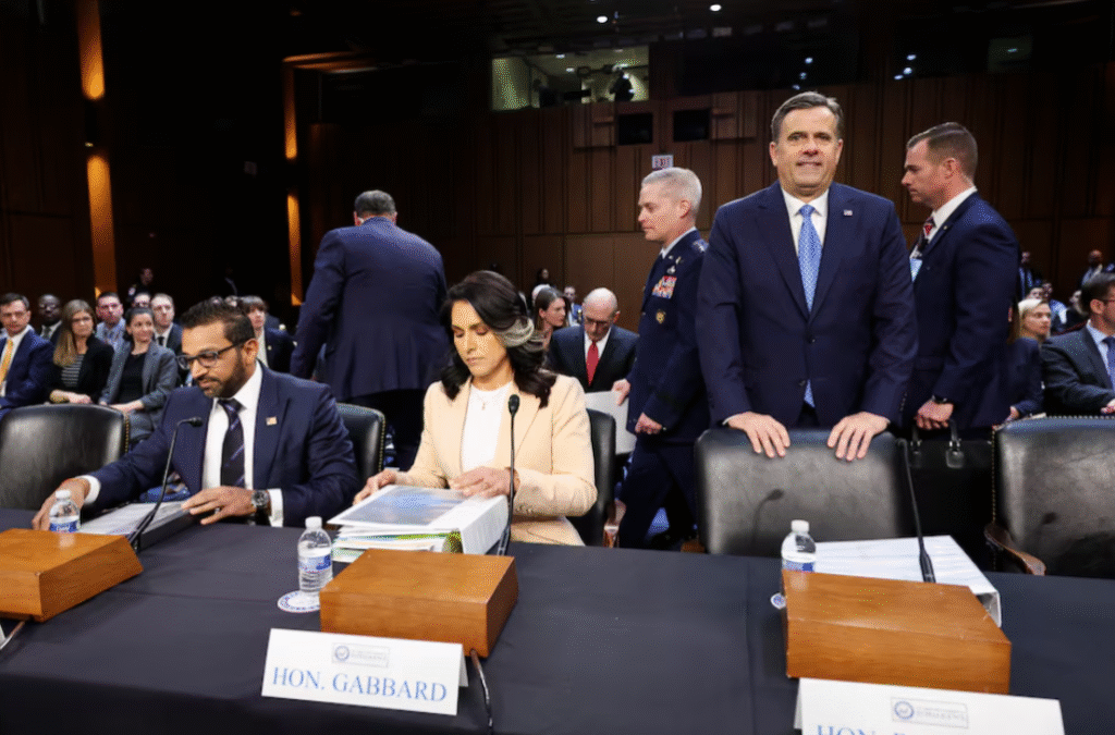 Director of National Intelligence Tulsi Gabbard, CIA Director John Ratcliffe and FBI Director Kash Patel appear on the day they testify before a Senate Intelligence Committee hearing on worldwide threats, on Capitol Hill in Washington, D.C., March 25, 2025.