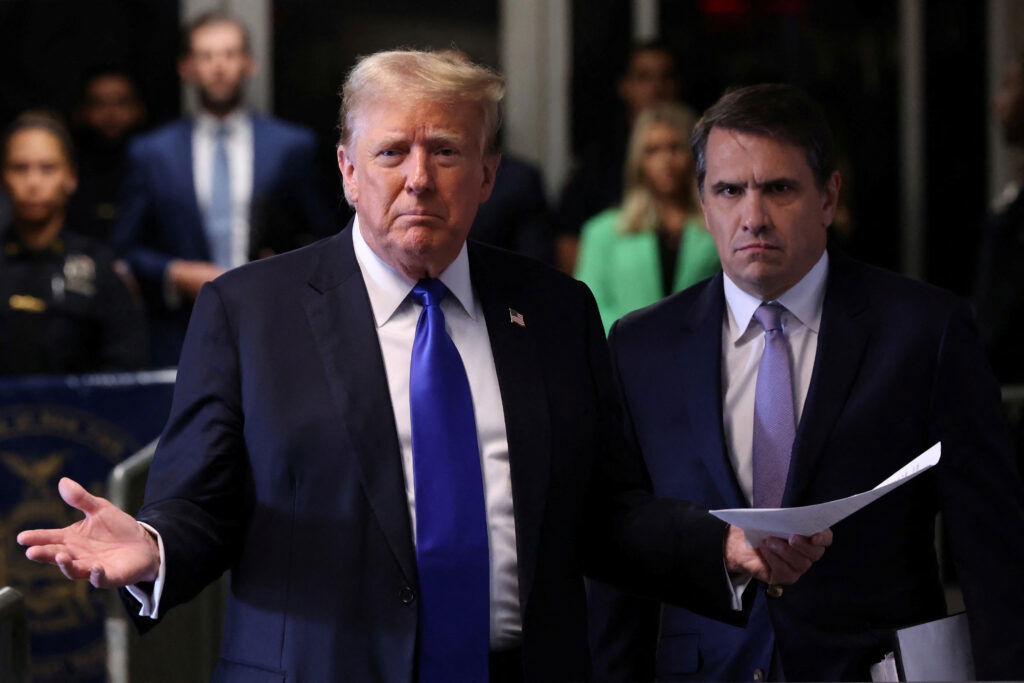 Former President Donald Trump speaks alongside his attorney Todd Blanche as he arrives for his hush money trial at Manhattan Criminal Court on May 30, 2024 in New York City.