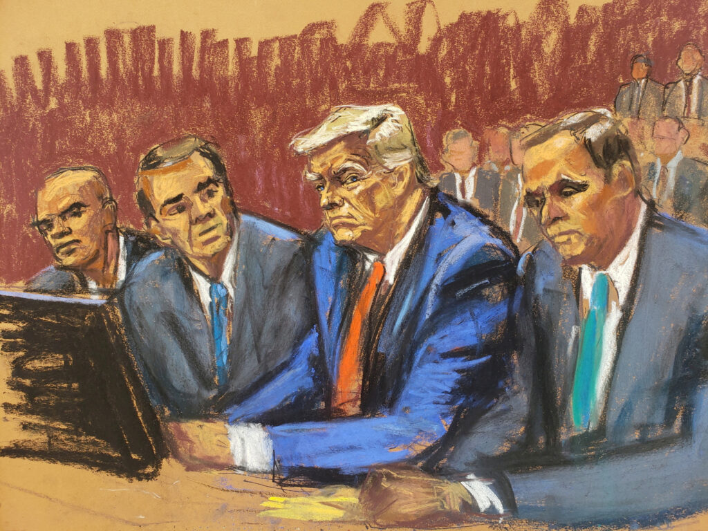 Former U.S. President Trump appears on classified document charges after a federal indictment at Wilkie D. Ferguson Jr. United States Courthouse, alongside his aide Walt Nauta and attorneys Chris Kise and Todd Blanche in Miami, Florida, U.S., June 13, 2023 in a courtroom sketch. REUTERS/Jane Rosenberg/File Photo
