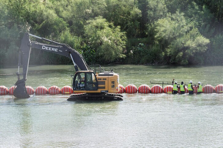 Workers install connected buoys, a measure by Texas authorities in an attempt to deter migrants from crossing the border, in the Rio Grande in Eagle Pass, Texas, U.S. July 24, 2023. REUTERS/Go Nakamura