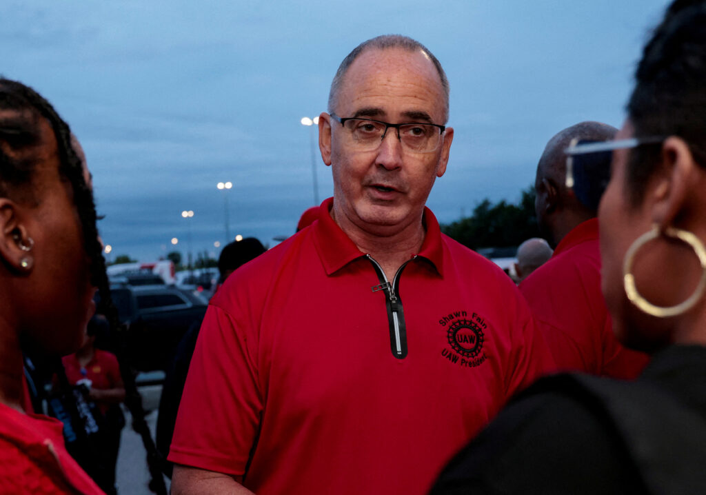 Shawn Fain, president of the United Auto Workers (UAW) speaks as U.S. President Joe Biden (not pictured) joins striking members of the United Auto Workers (UAW) on the picket line outside GM’s Willow Run Distribution Center, in Belleville, Wayne County, Michigan, U.S., September 26, 2023.