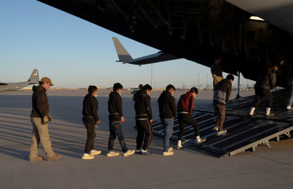 Migrants board a C-17 Globemaster III aircraft for a removal flight, Fort Bliss, Texas, January 23, 2025.