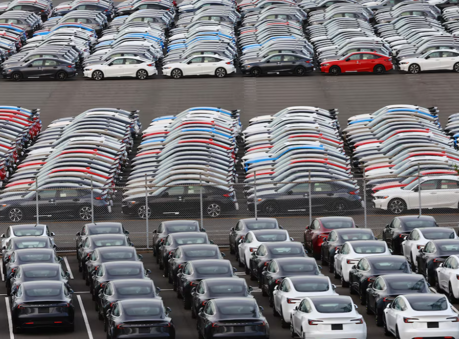 Honda and Tesla vehicles are lined up at a vehicle storage yard at an industrial port, on the day President Donald Trump struck a trade deal with Japan that lowers tariffs on auto imports, in Yokohama, near Tokyo, Japan, July 23, 2025.