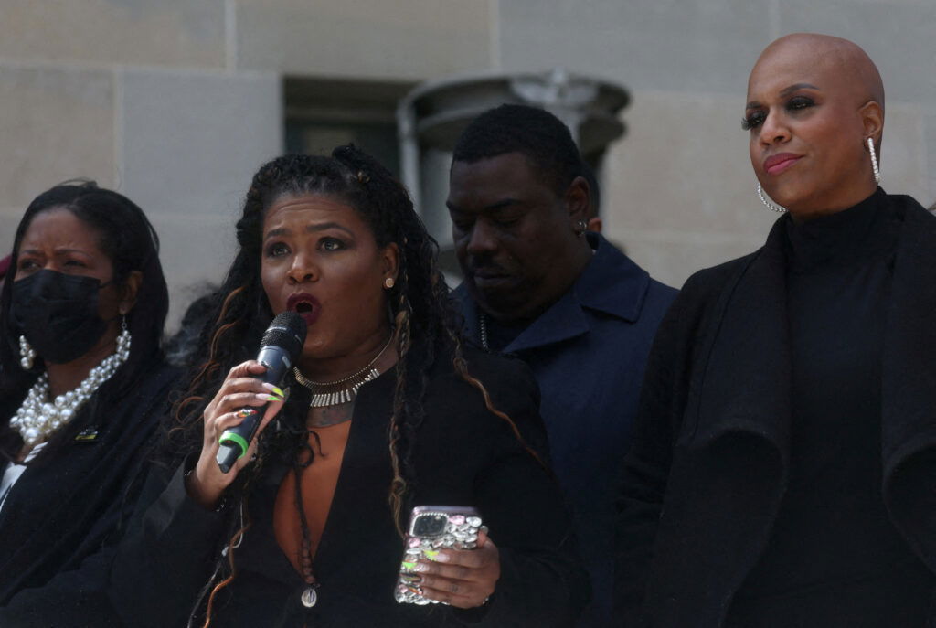 FILE PHOTO: U.S. Rep. Cori Bush (D-MO) rallies with U.S. Rep. Ayanna Pressley (D-MA) outside of the U.S. Department of Justice to call for an end to qualified immunity in Washington, U.S., March 3, 2022.