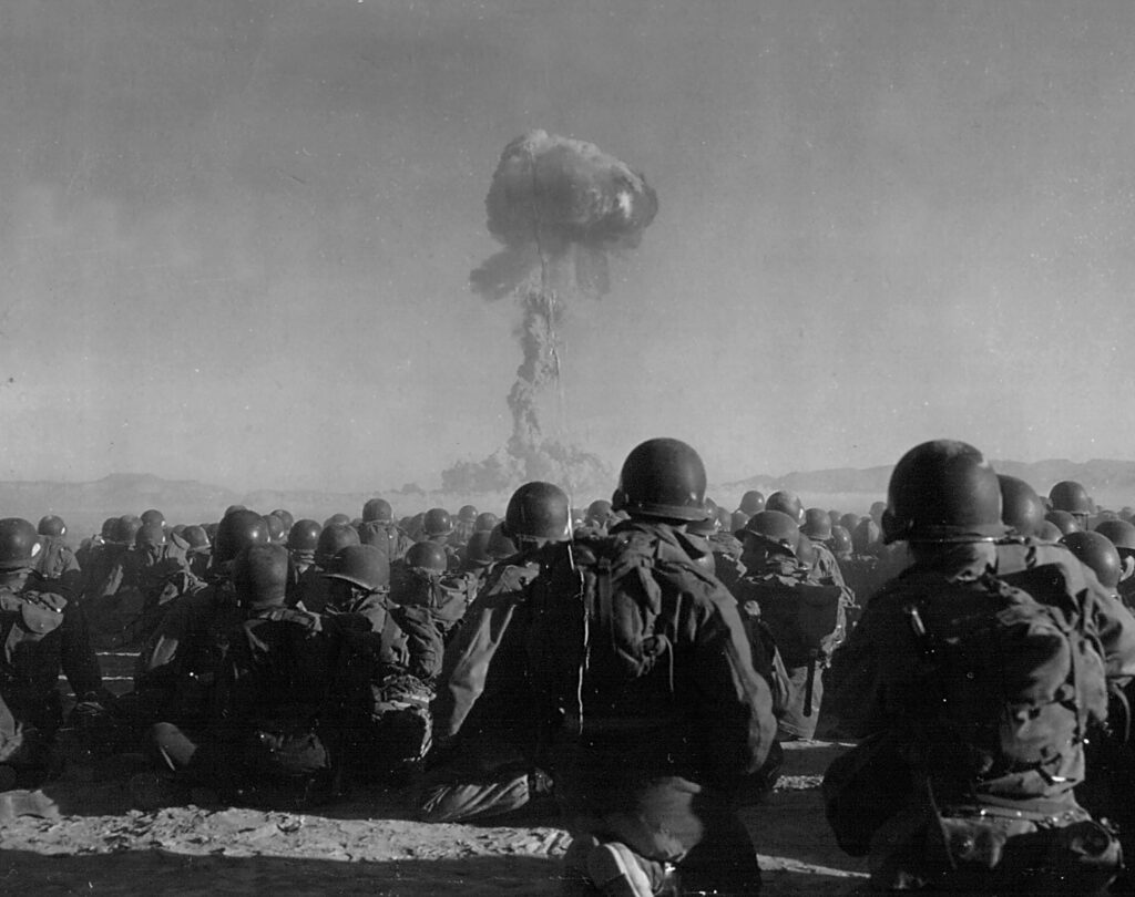 Troops of the U.S. Army 11th Airborne Division watch a plume of radioactive smoke rise on Nov. 1, 1951, after a blast at Yucca Flats, Nevada.