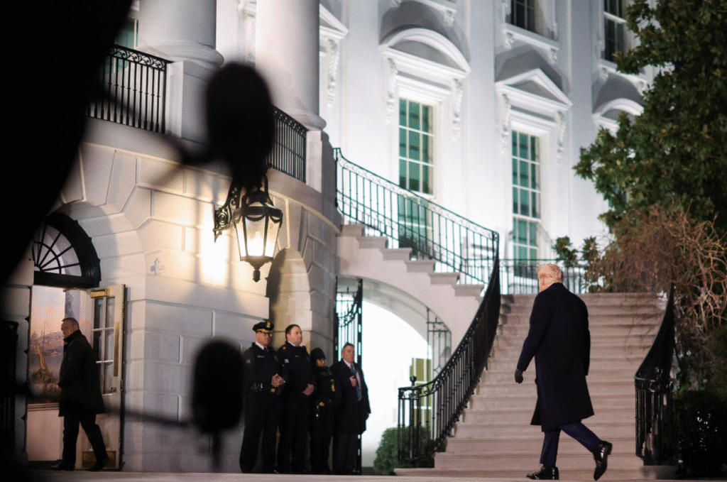 President Donald Trump walks as he returns from Florida to the White House, in Washington, D.C. on Jan. 27, 2025.