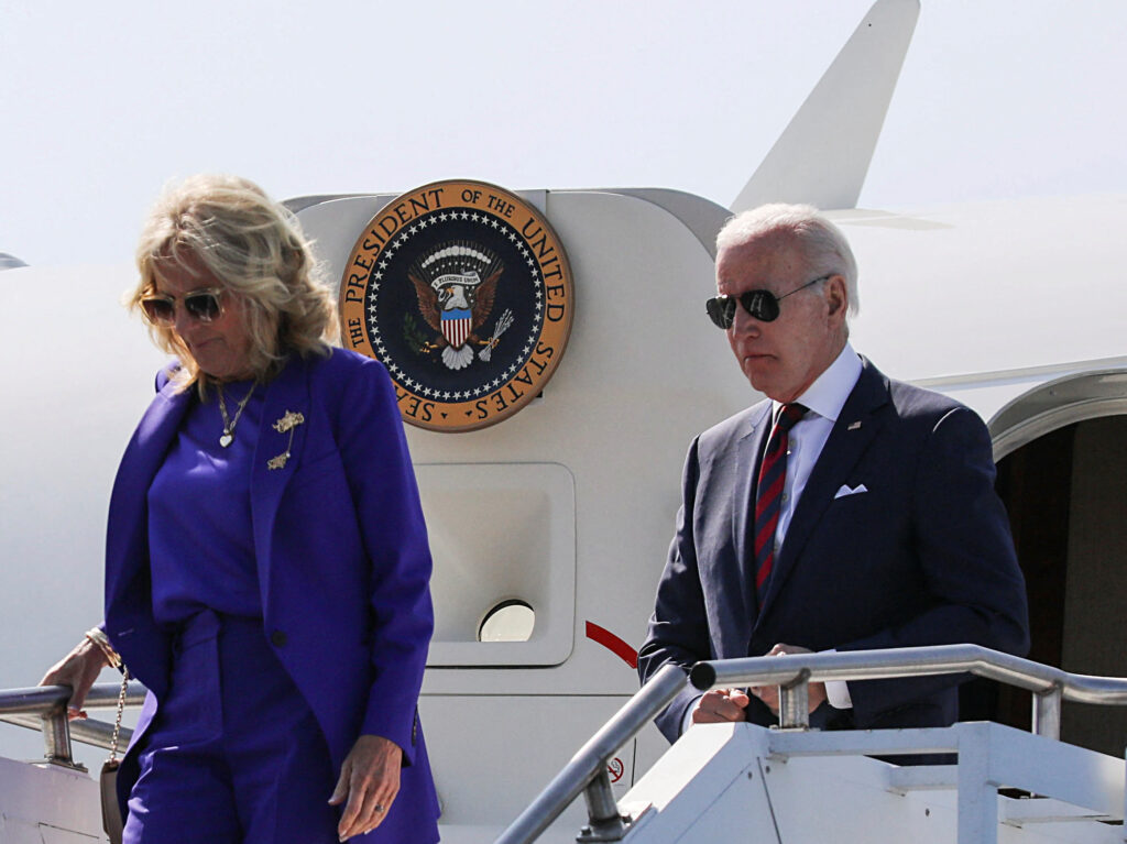 U.S. President Joe Biden and first lady Jill Biden disembark from ir Force One as they arrive at Philadelphia International Airport prior to attending the University of Pennsylvania graduation ceremony where their granddaughter Maisy Biden will receive her degree, in Philadelphia, Pennsylvania, U.S., May 15, 2023. REUTERS/Amanda Andrade Rhoades.