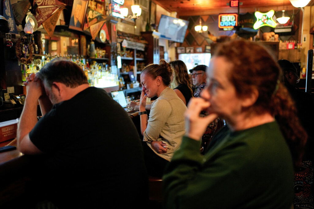 Donilee McGinnis, 42, regional organizing director for North Fulton for the Harris-Walz campaign, reacts while watching Democratic presidential nominee Kamala Harris give a speech at Howard University in Washington, conceding the 2024 presidential election to President-elect Donald Trump, at Manuel’s Tavern in Atlanta, Georgia, Nov. 6, 2024.
